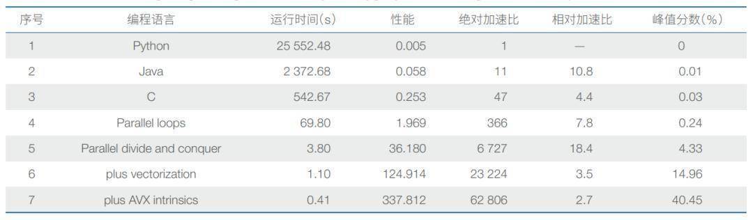 软件在这一轮大模型浪潮中往往被忽视。事实上,对于硬件架构确定、优化目标明确的场景,软件改进带来的总体收益通常大于硬件。2017年图灵奖获得者汉尼斯和帕特森于2018年4月在国际计算机学会(ACM)做获奖演讲时,给出了用不同编程方法计算两个4096×4096矩阵相乘的性能对比,该数据引用了美国麻省理工学院(MIT)计算机科学与人工智能实验室(CSAIL)雷瑟斯等人发表在Science上的文章There’s plenty of room at the Top: What will drive computer performance after Moore’s law? (《顶端仍大有可为:摩尔定律之后什么将驱动计算机性能发展?》,这里的“顶端”指代软件),具体对比数据见表1。从表中可以看到,用C语言编写比Python要快47倍,分治法并行优化后可得到6727倍的加速,而采用SIMD指令集则可加速6万多倍。同样,DeepSeek使用英伟达PTX,即介于CUDA高级编程语言和实际GPU机器代码之间的中间代码表示语言,也起到了极大的加速效果。